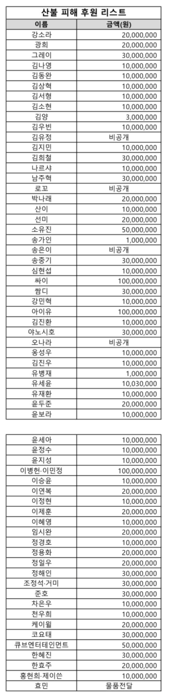 이런 어려운 상황 속에서 연예인들이 기부에 나섰습니다. 예를 들어, 이준호는 1억 원, 아이유는 2억 원을 기부하며 많은 사람들에게 감동을 주었죠. 또한, 세븐틴은 무려 10억 원을 기부하여 이번 기부 중 가장 큰 금액을 기록했습니다. 이 외에도 많은 연예인들이 기부에 동참하고 있으며, 그들의 기부 금액은 1천만 원에서 5억 원까지 다양합니다.